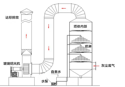 針對不同的廢氣成分選擇合適的處理方式是廢氣處理的基本,如上圖則是一張較為直觀的凈化流程。如果目的是清除廢氣中所含的灰塵,則在塔體內(nèi)部加入自來水即可,如果在廢氣中含有酸性成分,則需要將自來水更換為堿溶液(NaOH)。