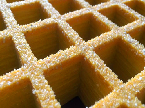 所謂磨砂工藝就是在格柵板拉紗工序完成時在格柵表面添加一些細砂石,然后再加熱使板材成型。這樣成型的玻璃鋼格柵板表面就會形成一層磨砂的防滑面。